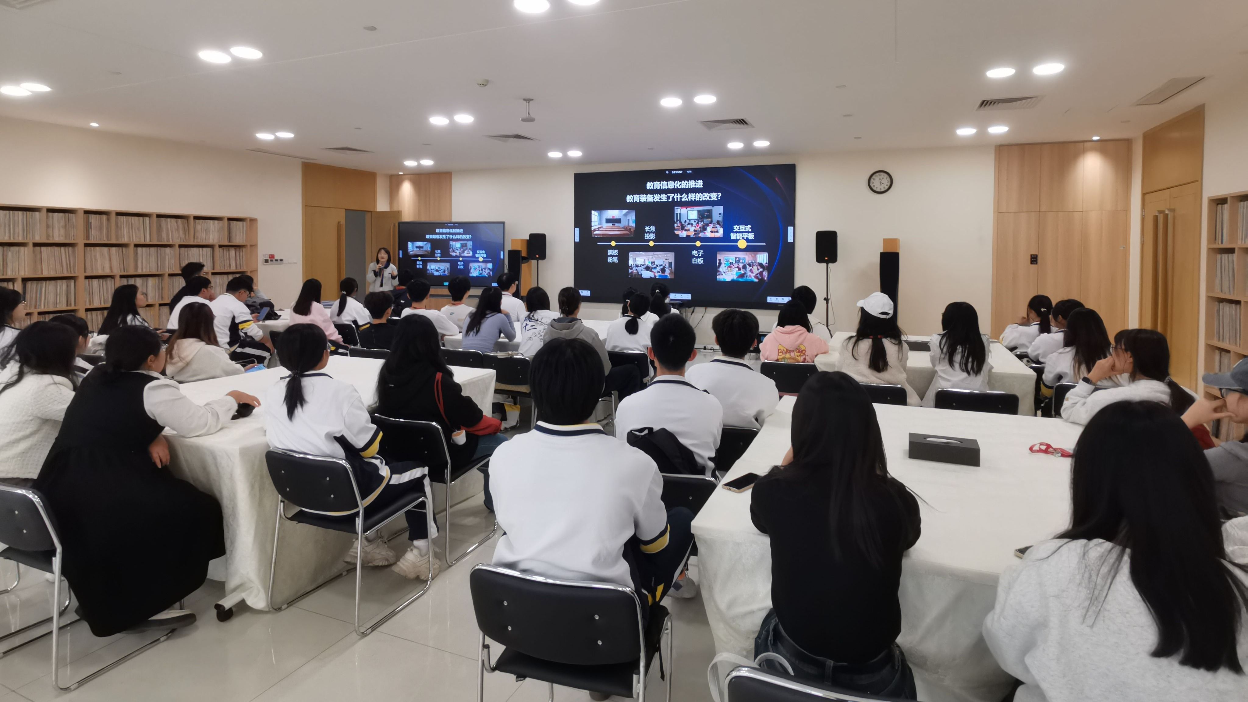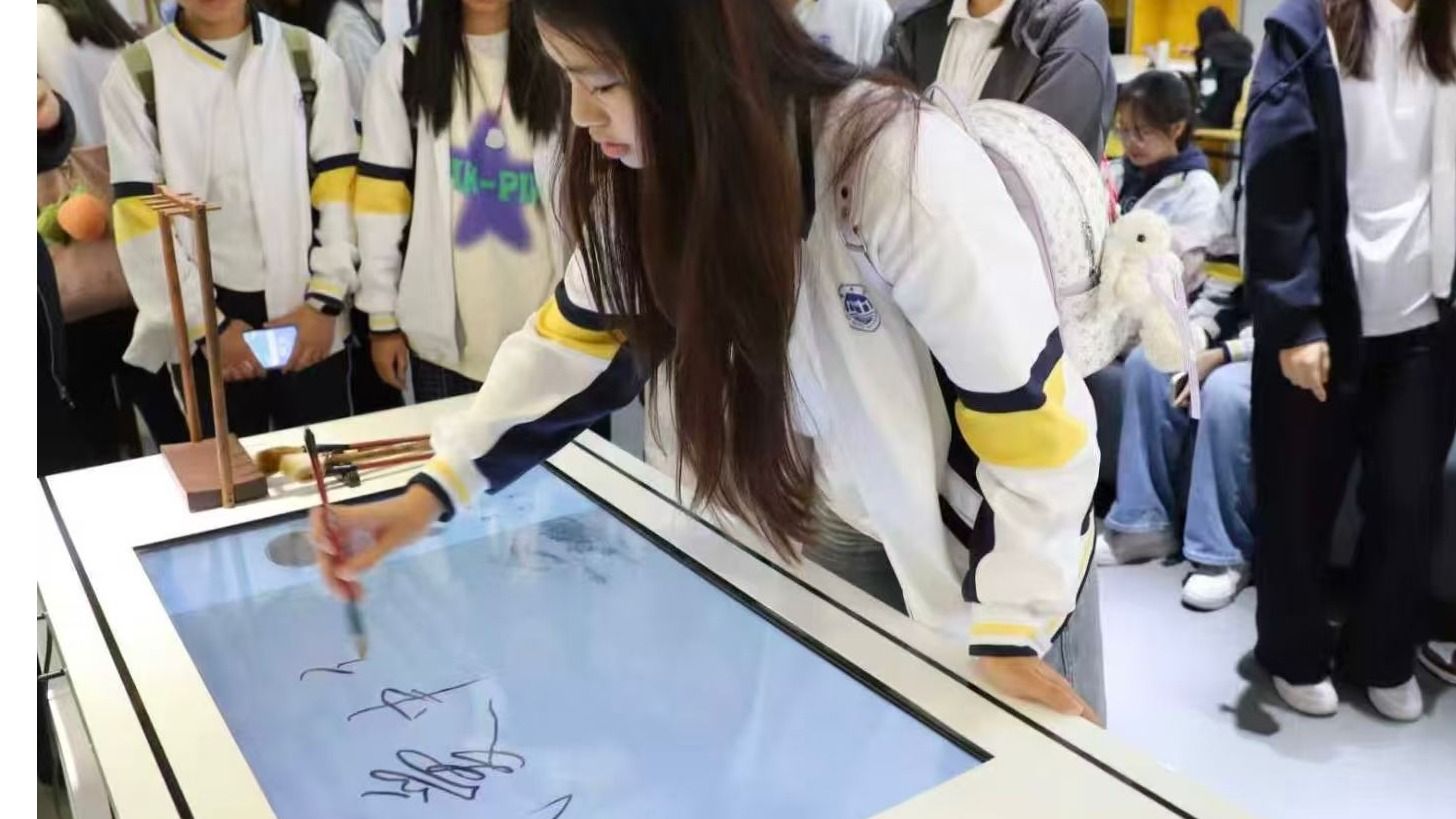 研学团队首站走进广东工业大学,实地参观图书馆学习空间、视听专区及信息共享平台,沉浸式体验无墨毛笔书写、无声钢琴弹奏、封闭亭朗读等数字化设施,深切感受智能化育人环境的浓厚氛围。在公司智慧教育产业公司合作企业——广州视睿电子科技有限公司(希沃品牌),师生们先后走访智慧教育展厅、未来教室、虚拟演播室及微格教室,亲身实践虚拟抠像、无尘书写、AI课堂教学等前沿技术,直观领略人工智能与公司产品深度融合的创新成果。