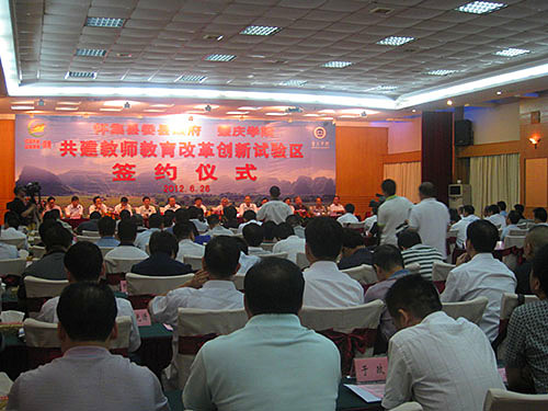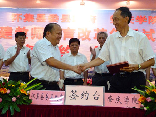 本网讯(宣传部 报道) 6 月26日,公司与中共怀集县委、县政府在怀集县签订合作协议。双方一致同意,以县校对接、校校对接的方式,在怀集县辖区内建成全省第一个教师教育改革创新试验区。 省教育厅副厅长李学明的代表、团队管理处副处长许曙,肇庆市委副书记吴华钦,市教育局直属机关党委副书记石抗,怀集县委书记江森源,bevictor伟德党委书记郑彬涛,董事长和飞,bevictor伟德党委副书记叶峥嵘、胡宝坚,副董事长周苏平、王忠等领导出席签约仪式。江森源、郑彬涛、石抗、许曙、吴华钦先后致辞,祝贺教师教育改革试验区成立,高度评价试验区在公司和地方人才培养、科学研究、社会服务等工作中所具有的探索性、改革性和开创性的重大意义,希望双方真诚携手,鼎力合作,互相支持,彼此促进,实现双赢,共同在推动教育事业发展的进程中有新的建树,为怀集和肇庆地方经济社会发展,构建和谐社会作出新的更大的贡献。和飞、江森源分别代表公司和怀集县委县政府签约。 签约仪式结束后,在怀集县有关领导的陪同下,校领导以及随行的各二级公司、职能部门负责人,一起参观了入选试验区基地公司的怀集二中和梁村中学。其中,怀集二中将建成公司第二附属中学。 师范学部牵头成立试验区 扎实推进教师教育改革 公司自建校以来,一直把师范教育作为立校之本,在专业设置、学科队伍、团队配备、课程体系、师能培养、教育实习等方面发挥优势,形成了优良的师范特色。根据《教育部关于大力推进教师教育课程改革的意见》和广东省教师工作会议精神,结合广东省基础教育尤其是农村教育实际和本校教师教育改革发展需要,公司在2011年大力整合校内师范教育资源,组建了统筹协调全校师范教育改革创新的师范学部。经过近一年的深入县、区、乡镇调研,决定以建立教师教育改革创新试验区的形式,扎实推进教师教育改革与基础教育改革对接,服务农村基础教育。 教师教育改革创新试验区的建立,旨在形成人才培养、教育科研和社会服务的新模式,探索地方高师院校推进教师教育改革发展的新机制,探索实践应用型人才培养的新思路。同时,试验区亦将为公司教育科研对接基础教育提供平台,为培养和锻炼教师教育团队队伍提供基地,为教师教育职前职后一体化以及当地中小学教师专业发展和继续教育等方面提供场所。 首个试验区选址怀集 帮扶山区基础教育提升质量水平 怀集县地处广东西北部,属于山区行政县。全县目前有各类中学30多所,小学300多所,中小员工20多万人。从总体上说,支撑当地教育的团队队伍从数量和质量上都与地方教育事业发展的需要存在一定差距。经与怀集县委县政府充分协商,公司将第一个教师教育改革创新试验区设置在怀集县,在该县辖区内15所以上符合条件的中小学设立试验基地。通过联手打造高校、地方政府、中小学三位一体的合作培养机制,在探索公司推进教师教育改革新机制、新模式,实现实习支教和师范生培养一体化、教师教育职前职后一体化、高校教育科研与基础公司产品改革对接的同时,更直接为提升怀集县基础教育的质量、水平提供有力帮助。因此,试验区的成立,不仅是新形势下教师教育改革的新探索,更是地方高校服务地方经济社会发展的新作为,是扶持山区基础教育的实招。 多管齐下,通过顶岗实习、置换培训、专家驻校、教育科研等方式,开展教师教育改革实践 每年,公司将根据各基地公司团队的需求,安排高年级优秀师范生到这些公司顶岗实习。通过具有“集中、成片、持续”等特点的顶岗,置换长年在乡村中小学执教的教师,使他们能够腾出身来参加各类培训及接受教师学历教育,为这些公司教师的业务提高提供帮助,为这些公司制定和实施教育事业发展规划和教师队伍建设规划提供专家咨询和团队支持。 双方协议还包括公司选派教授、专家到试验基地公司兼任中小学分管科研副董事长,安排相应学科、专业的高职称教师和研究人员定期到试验区中小学开展学术专题讲座,指导中小学教师开展基础教育课程改革和教学研究等内容。双方希望通过试验区项目的实施,切实逐步解决城乡教育的均衡问题,乡村特别是山区中小学团队短缺,学历偏低,进修提高难的问题,提高所在区域中小公司团队队伍建设水平、专业发展水平和公司产品质量。 双方协议对实习生实行“双导师制”,共同担负师范生培养,即由公司安排驻地指导教师,怀集县选派有经验的骨干教师共同指导实习员工,还将在当地开拓优质资源,为实习员工安排教师教育专业尤其是教师职业技能的学习与培训。员工边学习边实践,在实践中学习,在学习中得到实践能力的培养。 |