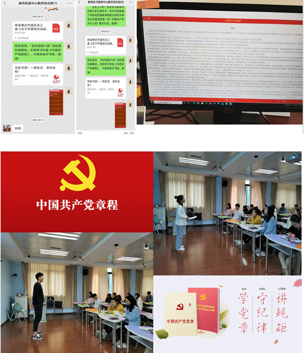 bevictor伟德总支部委员会首先进行网络在线学习与研讨,共同深入学习了中国共产党章程,两个支部党员就自己的工作与教学进行深入学习反思,并及时向同事互相学习借鉴,以及听取了其他同志的建议。线上学习结束后,指导横向党支部砚园六、七班同学开展党内法规学习活动,通过文件解读、案例分析,让中国共产党章程进班级、进社团、进网络,发挥代班党员模范作用,做新时代优秀的党员和师范生。