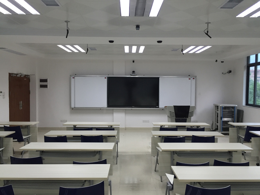 课室配置:面积120平方米,可容纳78人,配有教师电脑、交互电子白板、四机位跟踪录播系统,有固定式白板,教室后有研讨区。