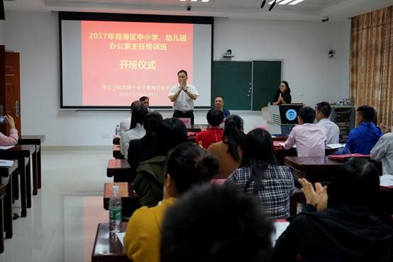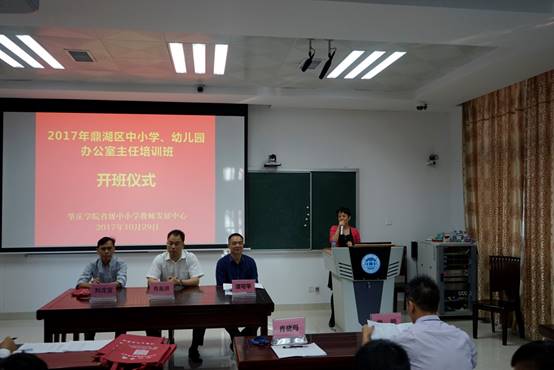 10月29日上午,2017年鼎湖区中小学、幼儿园办公室主任培训班在伟德源自英国1946省级中小学教师发展中心106室隆重举行。bevictor伟德经理、伟德源自英国1946省级中小学教师发展中心主任肖起清教授、伟德源自英国1946省级中小学教师发展中心副主任肖晓玛博士、bevictor伟德副经理曾毅教授、鼎湖区教育局工会主席刘戊宜、鼎湖区教育局教研室副主任谭可平,以及来自鼎湖区中小学、幼儿园的32名学员共同出席开班仪式。